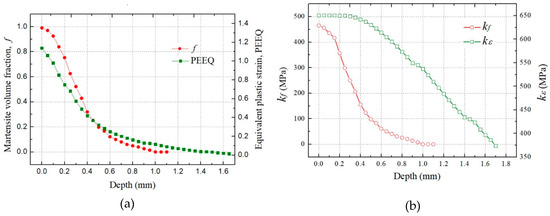 Figure 10a,b show the simulated equivalent plastic strain (PEEQ) and the martensitic volume fraction (f) of 301LN steel after multiple shots peening. It can be seen that both the PEEQ and f are maximum at the surface. Distributions of the PEEQ and f along the depth are both plotted in Figure 11a. PEEQ is of 1.139 at surface and decreases until zero at 1.65 mm, while f is of 0.99 at surface and decreases until zero at 1.1mm. It means that the austenite phase has been completely transformed into martensitic phase on the surface, while no martensitic transformation occurs under the depth of 1.1 mm.