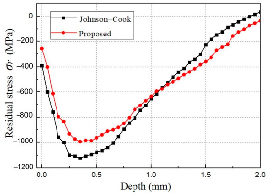 Distributions of the residual stresses along the depth by the Johnson–Cook and the proposed constitutive models.