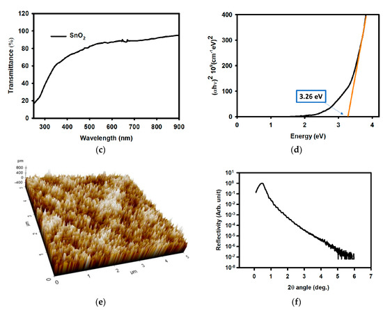 The surface roughness was analyzed via AFM, and the results are shown in Figure 1e. The root mean square (RMS) roughness was 0.155 nm. The density of the material was evaluated by XRR (Figure 1f) and showed a density of 5.29 g/cm3. The value was smaller than the density of polycrystalline SnO2, but similar to the one reported by Huang et al. [17] for the amorphous phase of SnO2 (5.01 g/cm3). The density and the optical bandgap of the a-SnOx were smaller than the values of crystalline SnO2. The reason could be that denser metal oxide materials have a higher density of overlap of the s-orbitals which, in turn, leads to a higher bandgap [23].