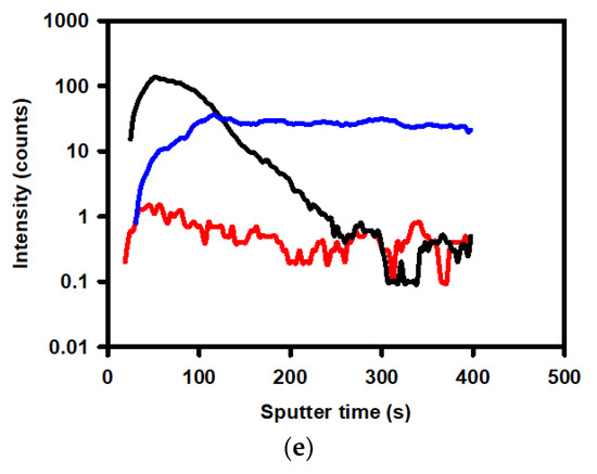 We evaluated the presence of carbon in the thin film by TOF-SIMS. We chose TOF-SIMS to evaluate the carbon content as the measurement gives higher precision than XPS. The depth profile of a-SnOx is shown in Figure 2e; only traces of carbon were observed in the film. The result exhibits the quality of the process, leading to an amorphous tin oxide thin film without carbon contamination.