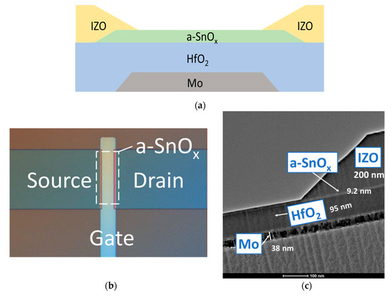 For potential use of a-SnOx in further applications, we employed a-SnOx as the active material in TFTs. Figure 3a shows the structure of the TFT used. Figure 3b shows a top view of a a-SnOx TFT taken by an optical microscope. Figure 3c shows a TEM image near the source/drain region. The thicknesses of Mo, HfO2, SnO2, and IZO were 38 nm, 95 nm, 9.2 nm, and 200 nm, respectively.