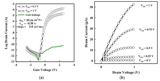 The TFTs were evaluated under DC operation; therefore, a low-frequency operation was used to evaluate the dielectric capacitance value. At 100 Hz, the capacitance of the HfO2 had a value of 219 nF/cm2. Note that the permittivity of HfO2 was 23, close to its theoretical value [27]. The TFTs field-effect mobility µFE, threshold voltage (Vth), subthreshold swing (S.S.), and ION/IOFF were 99.5 ± 15.4 cm2/Vs, −0.4 ± 0.04 V, 103 ± 16 mV/dec, and 2.2 ± 1.4 108, respectively. The typical TFT transfer and output characteristics are shown in Figure 4a,b. The TFTs had µFE, Vth, SS, and ION/IOFF values of 99.16 cm2/Vs, −0.38 V, 114 mV/dec, and 1.7 × 108. Note that the gate leakage was at least 105 smaller than the IDS current, ensuring that the TFT operation was not influenced by the gate leakage.