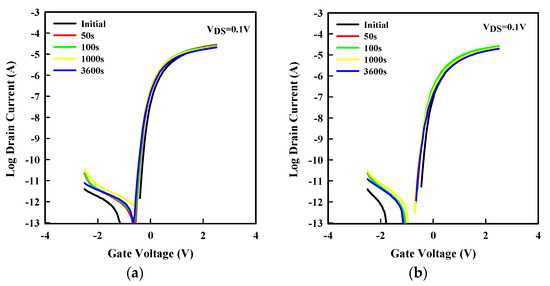 To evaluate the potential use of a-SnOx in TFTs, other metrics such as stability under gate bias stress can be used. Positive and negative gate bias stresses were applied for 1 h under VGS = 2.5 V and VGS = −2.5 V, respectively. Figure 5a,b shows the evolution of the transfer curve under PBS and NBS, which led to a |ΔVth| of 0.15 V and 0.05 V, respectively. Note that most of the ΔVth occurred within the first 50 s. It is suggested that defects are created near/at the dielectric interface with the a-SnOx layer [4,10,12]. Also note an increase in the IOFF during the applied stress. The increase in the OFF region can be understood as that more holes are available in the channel region. The holes may come from the created defects. Nonetheless, the IOFF remains in the 10 pA range suggesting that the number of holes remained small. Higher stability may be achieved via surface treatment such as UV treatment or plasma treatment [28,29].