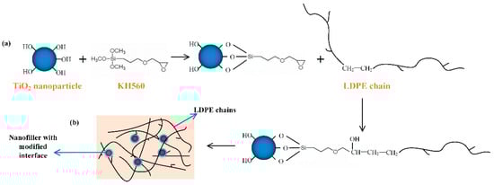 Figure 1 shows the flowchart of the surface modification. The (OCH3)3–Si– groups were reacted with the surface hydroxyl of TiO2 nanoparticles, and the alkoxy was linked to the LDPE chain. Consequently, the TiO2 nanoparticle surface could be modified, as shown in Figure 1a. Similar treatment can be found in Reference [21]. Figure 1b shows the schematic diagram of the dispersed TiO2 nanoparticles with interfaces in the LDPE matrix. After surface modification, an interfacial region around the nanoparticle is introduced into the matrix.