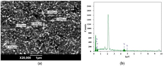 Figure 2 shows the scanning electron microscope (SEM) result of the 1 wt% and 5 wt% samples (cross-section). The images show the good dispersion of the nanoparticles. The majority of the nanoparticles were dispersed uniformly with a diameter of less than 100 nm. Furthermore, the result of the Energy Dispersion Spectrum (EDS) spectrum of 1 wt% sample indicates the existence of Ti and O elements in the TiO2 nanoparticles, as shown in Figure 2b. It can be verified that the TiO2 nanoparticles were introduced into the LDPE matrix.