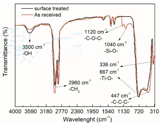 The FTIR result of as-received and surface-modified TiO2 nanoparticles was measured by FTIR device, IRPrestige-21, FTIR-8400S. Figure 3 shows the transmittance peaks of the FTIR result with the wavelength. It indicates that the new peaks occurred at 1120 cm−1 and 1040 cm−1, respectively. These stretching vibration absorption peaks present the –C–O–C– (1120 cm−1) and Si–O– (1040 cm−1) chemical bonds, which were ascribed to the chemical reaction between the coupling agent and the surface hydroxyl of TiO2 nanoparticles. In addition, compared to the as-received TiO2 nanoparticles, the absorption peak of hydroxyl (–OH) at 3500 cm−1 decreased in the surface-modified nanoparticles. It is accepted that the surface hydroxyl (–OH) of the TiO2 nanoparticles reduces by the chemical reaction with the coupling agent molecules. An increase of group –CH3 peak at 2960 cm−1 showed an increase after modification, which was generated by the coupling agent molecules. Some small molecule groups existed at a wavelength of less than 1000 cm−1. These peaks presented the Ti–O, –CH, –CO, –CN groups, indicating a slight increase after the surface modification. Hence, it can be concluded that the surface modification introduced the chemical bonding and polar groups on the TiO2 nanoparticle surface.