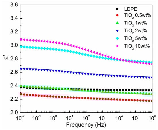 Figure 4 shows the real part permittivity of the LDPE/TiO2 nanocomposites. It indicated that the permittivity of the neat LDPE matrix showed a stable value (εr ~2.36) in the frequency range due to its nonpolar dielectric. However, the used LDPE polymer usually contains some defects and additives during the manufacture, such as antioxygen and stabilizer, forming some polar groups. Consequently, the permittivity presented a slight decrease in the high-frequency region, as shown in Figure 4. Interestingly, the permittivity showed a reduction at the low loading samples (<2 wt%). Furthermore, the decrease of permittivity with the frequency became obvious, indicating more polar groups were introduced in the nanocomposites. At the high loading (>2 wt%), an obvious increase of permittivity (higher than that of neat LDPE) could be obtained, as shown in Figure 4. In addition, high permittivity occurred at low frequency, while low permittivity existed at high frequency. This could be responsible for the Debye polarization theory [22].