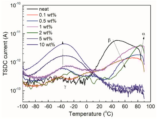 Figure 5 shows the TSDC plots of LDPE/TiO2 nanocomposites. Incorporating with the TiO2 nanoparticles altered the value and position of relaxation peaks in the TSDC results. At low loadings (≤2 wt%), the α peak increased and shifted to high temperatures, the β peak decreased and moved to high temperature, while the γ relaxation presented a slight increase with the loading. It is worth noting that the γ relaxation presented a significant increase at a high loading sample (>1 wt%). It shifted slightly to the high temperatures with the increase of loading. Furthermore, the α peak becomes much smaller for the 5 wt% and 10 wt% samples. Similar TSDC results are described in LDPE/Al2O3 nanocomposites [8].