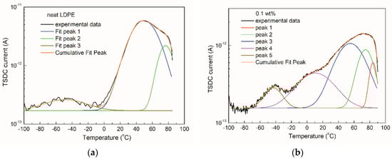 In order to evaluate the trap parameters underlying the TSDC results, it is necessary to fit the relaxation processes of the TSDC plots. Figure 6 shows examples of the fitting curves in the TSDC results. Three typical peaks, that is α, β and γ peaks could be well fitted for the neat LDPE. In the case of 0.1 wt% sample, five peaks were used to fit the TSDC plot. Among them, peak 1 and 2 associated with the α relaxation presented the deep traps. The peaks 3 and 4 (β relaxation) indicated the shallow traps. The peak 5 (γ relaxation) was a kind of much shallower trap related to the charge carrier mobility.