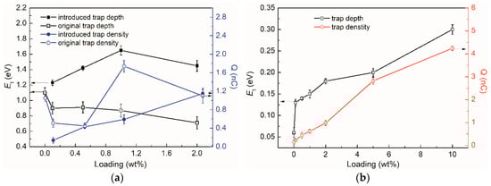 Figure 7 shows the influence of nanoparticle loading on both deep and shallow traps parameters (data from Table 1). For the low loading samples (≤2 wt%), the introduced new deep trap depth and density showed an increase with loading. In addition, the original deep trap depth slightly decreased (1.1 eV→0.72 eV). Its trap density exhibited an initial decrease and then increase with loading, as shown in Figure 7a. The decrease of original traps was probably derived from the strongly bound polymer chains at the interface region. However, the increase of the traps was likely due to the interaction between nanoparticles (1 wt% and 2 wt%). Figure 7b shows the increase of shallow traps with the loading. It appeared that the trap depth and density were quite small at low loadings (<2 wt%). However, it significant increased at high loadings (>2 wt%). It turned out that the large amounts of TiO2 nanoparticles contributed to the shallow traps in the nanocomposites.