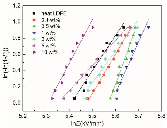 A typical two-parameter Weibull distribution method [27] was employed to analyze the breakdown data of LDPE/TiO2 nanocomposites. A straight line was obtained by Weibull analysis, as shown in Figure 8. The position of the fitted line (lnE direction) presents the breakdown strength, and the slope of the line indicates the dispersibility of the breakdown data.