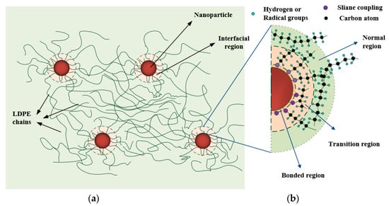 Interface region and morphology caused by surface modification of nanoparticles in LDPE/TiO2 nanocomposites. (a) Distributed nanoparticles with interface in LDPE matrix; (b) morphology in the interface region due to physicochemical interactions.