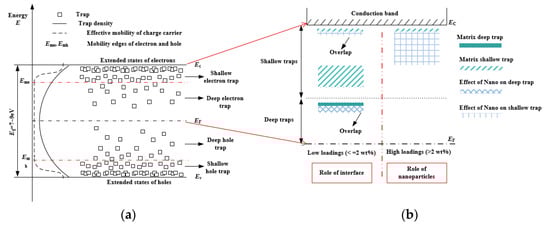 Trap variation due to interface region and nanoparticles in LDPE/TiO2 nanocomposites based on the energy band diagram. (a) Energy band structure; (b) effects of interface and nanoparticles on traps.