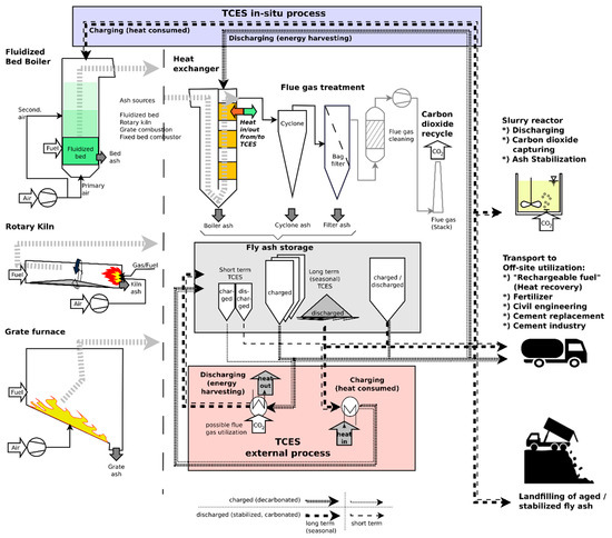 - The second requirement for a TCES material (exothermic reaction by reaction with reactive gas components (H2O and CO2)) was met by fly ash sample C-boiler. The energy content in fly ash sample C-boiler obtained by thermal treatment up to 880 °C was approximately 226 kJ/kg, approximately 86 kJ/kg of which could be released under the selected operational conditions in STA.