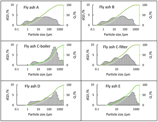 - The PSDs of fly ash samples E (fluidized bed), C-boiler (grate furnace), and D (rotary kiln), showed unimodal, bimodal, and multimodal distributions, respectively. Fly ashes A and B from grate furnace technologies with the same combustion processes showed the same PSDs with modes at appropriately 1, 10, and 100 µm.