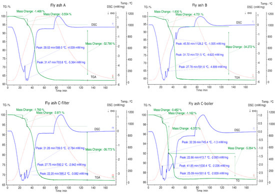3.5. Thermogravimetric Analysis and Differential Scanning Calorimetry (TGA/DSC) of Fly Ash Samples