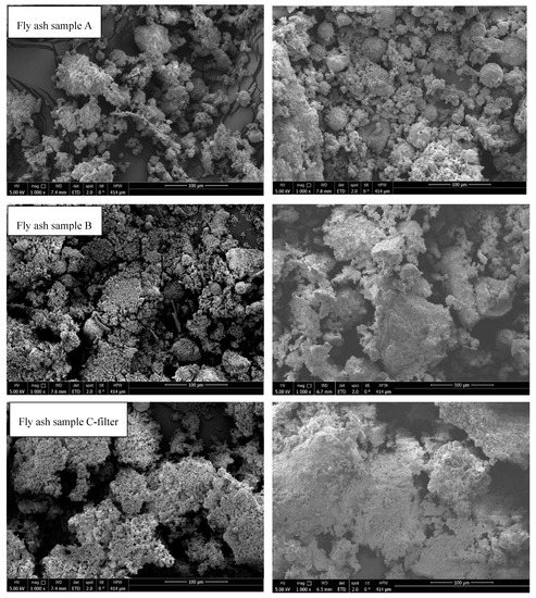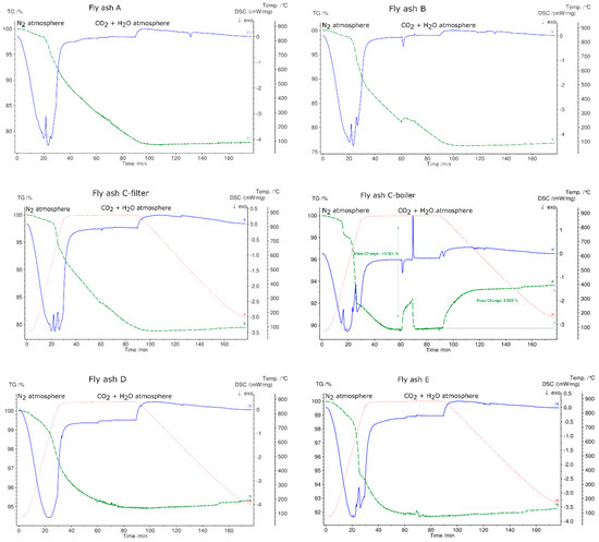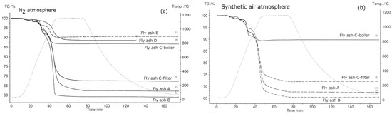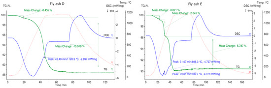 - SEM analysis of all samples before and after thermal treatment by STA up to 1150 °C in N2 atmosphere revealed sintering, agglomeration, and melting of particles. However, fly ash samples were in compact powder form and easily removable from the crucible, except for fly ashes D (rotary kiln) and E (fluidized bed) because they melted.