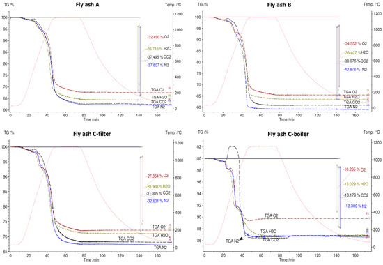 - Based on TGA results up to 1150 °C in N2 atmosphere, fly ashes A, B, C-filter, C-boiler (grate furnace), D (rotary kiln), and E (fluidized bed) achieved total mass losses of 37%, 40%, 32%, 13%, 11%, and 9%, respectively. Fly ash sample C-boiler had the highest energy content of 394 kJ/kg, and no endothermic peaks were detected for fly ash sample D. Fly ash samples A, B, C-filter, and E possessed energy contents of 94, 85, 98, and 50 kJ/kg, respectively. This showed that all fly ash samples, except fly ash sample D from a rotary kiln, met the first requirement of TCES under the selected experimental conditions, which is to store thermal heat through endothermic reactions.