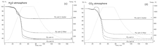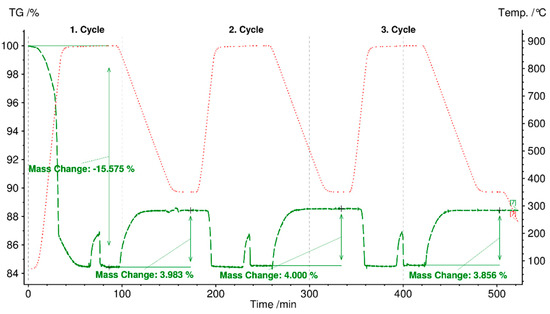 - Cycling stability tests, i.e., various charging and discharging of heat, as the third requirement for TCES materials, were accomplished for fly ash sample C-boiler for three cycles in STA. The charging step occurred at a heating rate of 30 °C/min up to 880 °C for 30 min, followed by heat storage between 99 and 290 kJ/kg. Discharging started at a cooling rate of 10 °C/min from 880 °C to 350 °C, maintaining at 350 °C for 30 min in CO2 and H2O vapor atmospheres, and followed by heat release between 73 and 101 kJ/kg.
