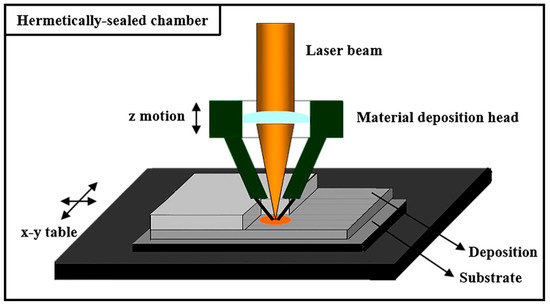 In ceramic Direct Energy Deposition (DED), the printing head of the apparatus contains a nozzle that feeds ceramic powder particles to the focal point of the laser beam. The ceramic powder melts and solidifies in layer-wise fashion on a substrate [25]. Figure 3 is the schematic illustration of LENS [26].