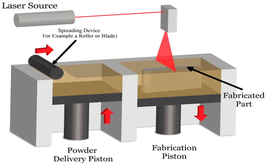 Powder bed fusion (PBF) technologies are among pioneer commercially used AM techniques created by the University of Texas USA. Selective laser sintering (SLS) based PBF technique [18], which melts the ceramic powder by laser energy source. The laser sintered the powder nearly to the melting point of the material to make each layer according to the given 3D design. The laser beam scans each new single layer of free-packed powder particles and consolidates them by sintering this process and proceeds in a layer-wise fashion to complete the final 3D object [35,36,37]. SLS is a powder bed fusion process have numerous applications in the bioengineering field such as to prepare customized products, biomedical implants as well as orthopedic implants [38]. The major disadvantage of SLS is the usage of higher temperatures that limits the insertion of biomaterial and cells into SLS scaffolds during the manufacturing process [39]. A schematic diagram illustrates the underlying operating system [40] of the powder bed fusion provided in Figure 6. While SLS technology is amended, the PBF method to increase machine efficiency.