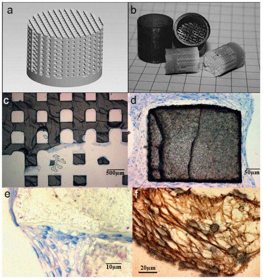 (a) Computer aided design (CAD) designed virtual structure of casting mold; (b) Resin casting molds manufactured by stereolithography and sintered hydroxyapatite (HA) structures; (c) SEM image of HA scaffold after culturing with MC3T3-E1 cells for 2 weeks, scaffold is visible in (dark grey) and cells (blue); (d) SEM image of strut of HA scaffold (grey), entirely attached with cells (blue/pink); (e) SEM image of microstructure of a crack between two struts, which was totally covered by MC3T3 cells (blue) and matrix created by the cells(pink); (f) SEM images of collagen produced by the cells (the microtome sectioning eliminates the mineral scaffold) [80].