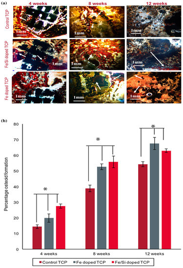 (a) Osteoid formation in pure and doped tricalcium phosphate (TCP) scaffolds after Modified Masson-Goldner trichrome staining after 4, 8, and 12 weeks. Black: prosthesis, orange and red: osteoid, bluish green: mineralized bone. Reddish-orange colors indicated by arrows showing new bone formation. Fe doping showed more bone mineralization as compared to others. (b) Histomorphic analysis showed Fe-Si doped TCP boosted initial stage osteoid formation for the period of 8 weeks and Fe doped TCP shows better mineralization of bone for 12 weeks of implantation [92].