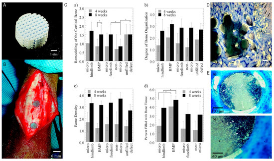In another study, a robocasting technique was utilized to transport bone morphogenic protein 2 (BMP-2). HA slurry and polymethylmethacrylate (PMMA) microspheres were mixed together to achieve controlled microporosity. Resins were eliminated by sintering the scaffolds at 1300 °C for 2 h. Thereafter, 10 µg of bone morphogenic protein 2 was added to the microporous scaffolds in goat bone for in vivo characterization for 4 and 8 weeks. Outcomes from this study showed great potential for manufacturing HA scaffolds containing interconnected porosity. Furthermore, the existence of bone morphogenic protein 2 and micro porosity upgraded scaffold osteogenesis ability as illustrated in Figure 15 [127].