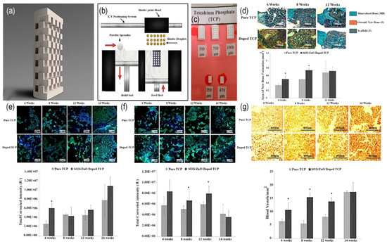 Fielding et al. introduced (Si/ZnO) doped three-dimensional composite TCP scaffolds with a pore size of 300 µm using binder jetting technique. The pure and (Si/ZnO) doped 3D-printed TCP scaffolds implanted into a rat femur bone for the period of 6, 8 and 12 weeks to analyze the histomorphometry and Immunohistochemistry. Results have proved that combining Si-ZnO dopants in TCP are best alternative to achieve osteoinductive properties of calcium phosphates (CaPs) for the clinical application of bone implants as shown in Figure 16 [118].
