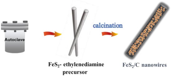 As shown in Figure 1, the synthesis process of FeS2/C catalysts mainly consists of two steps. Firstly, FeS2–ethylenediamine nanowires are synthesized by a hydrothermal method. In this solvothermal reaction, FeCl2·4H2O and sulfur powder are used as the Fe and S sources, respectively. Ethylenediamine and ethylene glycol are used as both ligand and solvent, and PVP is a good surfactant to tune the structure and morphology of the composite. Later on, FeS2/C nanowires are readily prepared by pyrolysis of the precursor. The decomposition of the organic molecules generates pores in the carbon shells of the nanowires.