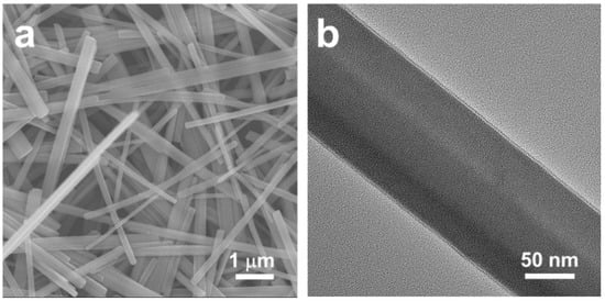 The morphology of the as-prepared FeS2–ethylenediamine precursor are determined by electron microscopy. The SEM (Figure 2a) image reveals that the FeS2–amine nanowires (d ≈ 100 nm) and lengths up to tens of micrometers are successfully synthesized. The precursor is featured with a highly uniform nanowire morphology and a fairly smooth surface. The mixture solvent of ethylenediamine and ethylene glycol, which have linear configuration, are served as template molecules and induced the growth of the nanostructure during the solvothermal process [30,31]. Especially, ethylenediamine binds strongly to Fe ions [32,33]. PVP is frequently used for chemical reduction or for controlling the three-dimensional structure of the products. The lone electron pairs of oxygen on the PVP can give away, and coordinated with Fe ions in the reaction [34]. A 5 nm amorphous and uniform outer layer is shown by TEM (Figure 2b). This outer layer derives from the surfactant PVP. In order to verify the effect of PVP on the structure of the composite, the precursor without the addition of PVP is synthesized. As shown in Figure S1a,b, the precursor was composed by nanowires and bulk particles. The width of nanowires in this sample was much larger than that of the FeS2–ethylenediamine precursor with the addition of PVP. The TEM image in Figure S1b shows that the edge of FeS2–ethylenediamine is smooth and without any layer encapsulation. The content of the outer layer is also verified by the characteristic absorption peaks in the FTIR spectra of the precursor FeS2– ethylenediamine nanowires (Figure S2). The strong νas(CO) mode at 1648 cm−1; ν(CC) mode at 1114 cm−1; and νas(CH) and νs(CH) stretch modes at 2932 and 2866 cm−1, respectively, indicate the existence of PVP [35].