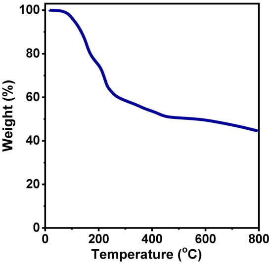 Figure 3 shows the TGA curve of the FeS2–ethylenediamine precursor under an N2 atmosphere between 20 and 800 °C. The small loss at the start (below 100 °C) is because of the loss of water. It starts to dramatically lose weight at around 120 °C until reaching the temperature of 300 °C, with a loss of 42.3%, attributable to the evaporation or decomposition of organic content. Only 12.6% weight loss is observed from 350 °C to 800 °C due to the further transition of pyrite FeS2. Thus, 350 °C is chosen as the calcination temperature to obtain FeS2.
