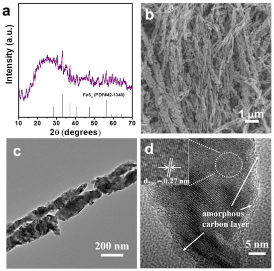 (a) X-ray diffraction (XRD) pattern, (b) SEM image, (c) TEM image, and (d) high-resolution TEM (HRTEM) image of as-prepared FeS2/C nanowires.
