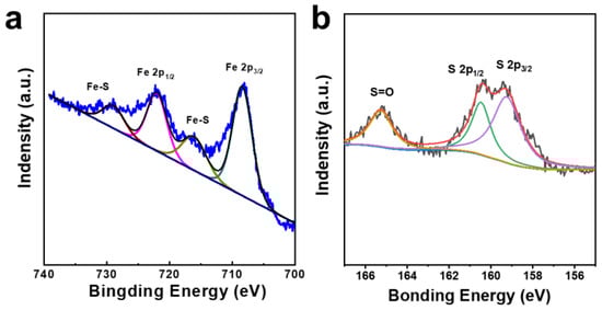 The XPS measurement is carried out to examine the elemental compositions and atomic bonding states of FeS2. The high-resolution XPS of Fe and S of FeS2/C nanowires were deconvoluted, and the results are shown in Figure 5. Figure 5a shows the Fe 2p3/2 and Fe 2p1/2 peaks of Fe at 708.5 and 723.5 eV, respectively. Figure 5b shows the XPS of S 2p of FeS2/C nanowires. The two peaks centered at 159.3 and 160.5 eV should be assigned to S 2p3/2 and S 2p1/2, respectively [36]. The S 2p presented in Figure 5b shows a peak around 165.2 eV, characteristic of the sulfate species, which may be because of the presence of the FeSO4 phase. Additionally, it has been demonstrated that FeSO4 species are produced on the surface of FeS2 when it is exposed to water [37].