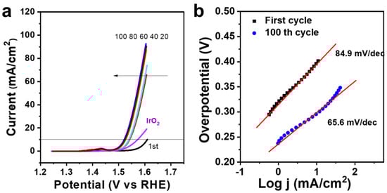 The OER activity of FeS2/C catalysts was investigated in a 1.0 M KOH aqueous solution. The working electrode was made of glassy carbon covered with FeS2/C nanowires, the counter electrode was a Pt plate, and the reference was the Hg/HgO electrode. LSV scans were performed on the commercial IrO2 as the benchmark and FeS2/C catalysts at different scan cycles (Figure 6a). The early onset and the large anodic current of all samples indicate their high OER catalytic activity. Figure 6a shows that the working electrode has a good catalytic activity for OER at the first cycle, which is better than the pure iron sulfides without doping other metal ions reported before [19]. The porous structure provides more sites for the OER reaction, and the encapsulation of carbon enhances the conductivity of the catalyst toward a fast electron transfer. The catalyst performance of the FeS2/C nanowires is still slightly worse than that of the commercial IrO2 catalyst. However, the catalytical activity of the FeS2/C nanowires enhanced with the cycling, owing to the activation of FeS2. The FeS2/C sample has a reduced potential of 1.58 V, an overpotential of 350 mV, and a current density of 10 mA/cm2 at the 20th cycle, which continue reducing until the 80th cycle. Furthermore, an impressively low onset potential of 257 mV and overpotential values of only 291 mV and 338 mV were obtained for the current densities of 10 mA/cm2 and 50 mA/cm2, respectively, at the 100th cycle, which are much lower than those for the first cycle, indicating the succesful activation process of FeS2 during cycling. Furtermore, the CV curves of FeS2/C nanowires were also tested in 1 M KOH at various scan rates. As shown in Figure S4, when the catalyst scans at a high scan rate, such as 10, 50, and 100 mV/s, all the CV curves exhibit a pair of redox peaks with a redox potential of about 1.42 V, which is assigned to the redox reaction between Fe2+ and Fe3+.