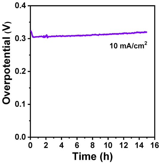To evaluate the electrocatalytic durability of the FeS2/C catalyst, chronopotentiometric measurements towards the OER were performed at 10 mA/cm2. As shown in Figure 7, the potential of the FeS2/C catalyst decreases at the beginning, owing to the activation of FeS2. Furthemore, the FeS2/C catalyst stayed stable for 15 h without an appreciable change in overpotential. Thus, these results confirm that FeS2/C is a promising catalyst in alkaline 10 mA/cm2 solutions. Surprisingly, the as-prepared FeS2/C nanowires presented a superior or comparable activity to many recently reported OER catalysts (Table S1). For example, Ni/MoxC (overpotential@10mA/cm2 = 328 mV, Tafel slope = 74 mV/dec) [39], Fe3C@NCNT/NPC (overpotential@10mA/cm2 = 339 mV, Tafel slope = 62 mV/dec) [40], γ-MoC/Ni@NC (overpotential@10mA/cm2 = 310 mV, Tafel slope = 62.7 mV/dec) [41], Fe3C@NG-800 (overpotential@10mA/cm2 = 361 mV, Tafel slope = 62 mV/dec) [42], FeNiS2 NSs (overpotential@10mA/cm2 = 310 mV, Tafel slope = 46 mV/dec) [43], and CP/CTs/Co-S (overpotential@10mA/cm2 = 306 mV, Tafel slope = 72 mV/dec) [44].