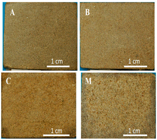 The two lithotypes that exist in the monuments include four varieties of sandstones that were identified in Atouguia da Baleia (Peniche) in the Portuguese Western region [1]. Walls of stone masonry were elected close to the built heritage, and some specimens similar to the stones in the monuments were extracted, as no coeval quarries or outcrops with similar materials were detected in areas close to Peniche. Physical tests were also carried out in order to obtain values of porosity and water absorption under low pressure of those samples collected, considering their resemblance based on surface appearance, mineralogical, texture, and structure properties. The representative samples of the four varieties in Figure 3 have similar average values of water absorption under low pressure coefficients compared to the stone in the monuments built in the Middle Ages (Figure 2): 0.8 kg/m2h1/2 (A), 2.4 kg/m2h1/2 (B), 6.2 kg/m2h1/2 (C), and 26 kg/m2h1/2 (M). These two lithotypes are designated as lithic arkose [1,15], according to Folk [44]. Varieties A and B included in lithotype A + B have about 30–32% quartz and 34–40% carbonates, and varieties C and M of the lithotype C + M have about 20–25% carbonates and 40–51% quartz. Both lithotypes were classified as lithic arkose with carbonate cement. Well-defined lineation is exhibited macroscopically in lithotype A + B. The A variety exhibited one major orientation of mica minerals, and the variety B showed no preferred orientations once the lineation was randomly distributed on thin sections under a polarizing microscope. Lineation was not identified in variety M, and thin sections of variety M showed two major orientations of mica minerals. The two lithotypes have around 4–6% of mica minerals.