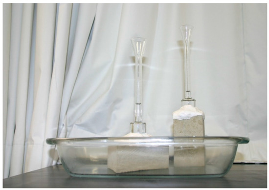 The values of porosity, density, and coefficient of water absorption under low pressure of the sandstones were given according to RILEM (1980) [45] and EN1936 (1999) [46] standards. A vacuum to saturate the samples is suggested by both standards. Archimedes-principle-based calculations were carried out to determine the pore volumes filled with water and allowed the attainment of porosity, bulk, and real densities. Other tests were carried out to obtain other physical properties, namely capillarity and mercury intrusion porosimetry [1]. The experimental apparatus is shown in Figure 4. The procedure of RILEM’s test of water absorption under low pressure [45] was carried out on sandstone specimens of prismatic shape. The Karsten tube was held on the sample surface by means of a replaceable and not harmful putty. The water filled the vertical pipe from the base upwards the top level ’’0’’. A total measuring height of 0.098 m and a volume of 4 cm3 were the main specifications of the pipe. The results were obtained from the water absorption under low pressure graphs (mass of fluid per area of its absorption) as a function of the square root of time, and the water absorption coefficient was given by the slope of a linear trend fitted to the first part of the test curve. The values of this parameter are usually given in the following sensitive units: kg/m2/√h.