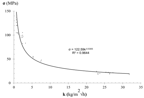 Relationship between compressive strength (σc) and coefficient of water absorption under low pressure (k) obtained from sandstone samples.