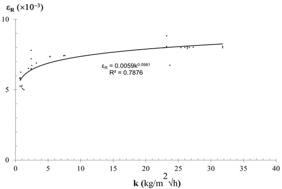 The parameter coefficient of water absorption under low pressure also allows the description of the compression behavior of rocks as was earlier reported for porosity by Ludovico-Marques [1] andLudovico-Marques et al. [15]. A correlation between the strain at compressive strength and the physical properties of materials can be acomplished, assuring, as another important property, the complete description of the analytical model. The variation of strain at failure (εR) with the coefficient of water absorption under low pressure on the samples of sandstone varieties are shown in Figure 6. As the coefficient of water absorption under low pressure obtained by the Karsten pipe decreases, the compressive strain at failure increases. This shows a clear trend between the variation of the compressive strain at failure and the variation of water absorption.