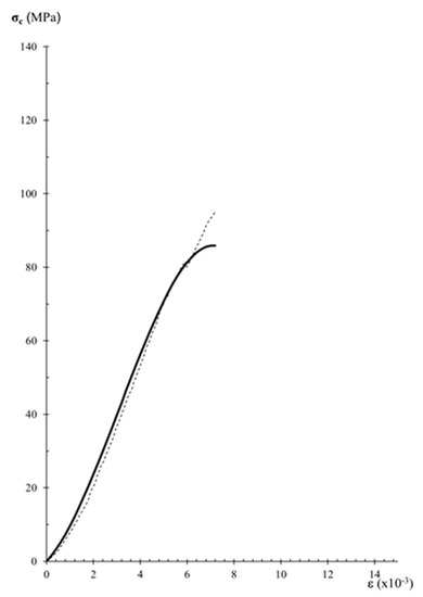 The comparison between experimental data of stress–strain curves and those obtained by the analytical expression of Equation (7) allows the assessment of the performance of the analytical model. Figure 7, Figure 8 and Figure 9, show experimental and analytical stress–strain curves. When comparing the curves in Figure 7, Figure 8 and Figure 9, a close fitting between the analytical and experimental results can be observed. The analytical expression is adequate for carrying out the description of the stress–strain behavior in the pre-peak hardening regime (Figure 7 and Figure 8). However, it can be observed that the analytical expression cannot predict the stress–strain behavior in the post-peak softening regime (Figure 9).