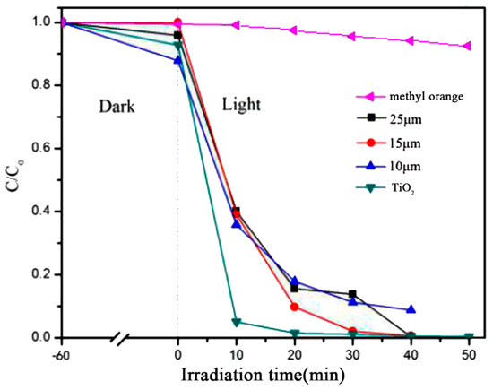 In order to investigate the effect of the particle size of CaCO3 on the properties of the prepared CaCO3–TiO2 composite photocatalyst, CaCO3–TiO2 composite photocatalysts were prepared with 25 μm, 15 μm and 10 μm CaCO3 as the carrier (the mass ratio of nano-TiO2 was 40%). Figure 1 shows the photocatalytic degradation of methyl orange by CaCO3–TiO2 and pure TiO2, and a blank experiment was also conducted. It can be seen that when the pure methyl orange solution was illuminated by the ultraviolet light only, the C/C0 remained almost unchanged with the increase of illumination time, indicating that there was no degradation effect on the methyl orange. By contrast, treatment with the CaCO3–TiO2 composite photocatalyst (the size of CaCO3 was 15 μm) and pure TiO2 both resulted in the effective degradation of methyl orange. After 30 min of irradiation, the C/C0 was reduced to less than 0.05, indicating that the degradation efficiency was higher than 95%; after 40 min of irradiation, the degradation efficiency reached 100%. Obviously, CaCO3–TiO2 has excellent photocatalytic performance, which is similar to that of nano-TiO2. Since the mass ratio of TiO2 to CaCO3–TiO2 was only 40%, the above results indicate that CaCO3 has an improving effect on the performance of TiO2.