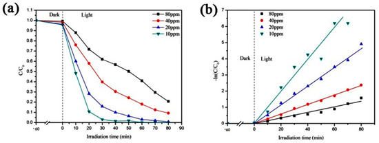 The investigation of the degradation performance of CaCO3–TiO2 in different concentrations of methyl orange solution can not only further verify the photocatalytic degradation ability of CaCO3–TiO2, but it can also determine its reasonable scope of application. Figure 3 shows the photocatalytic degradation effect of CaCO3–TiO2 for different concentrations of methyl orange solution. It can be seen that the degradation efficiency of the CaCO3–TiO2 composite photocatalyst on each concentration of methyl orange solution increased with the increase of the illumination time, and finally reached a higher degradation effect. Comparing the degradation effect of different concentrations, it was found that the degradation efficiency of methyl orange solution with concentrations of 10 and 20 ppm by CaCO3–TiO2 was higher than that of concentrations of 50 and 80 ppm. Among them, the methyl orange solution with concentrations of 10 and 20 ppm could be completely degraded (C/C0 = 0) by CaCO3–TiO2 at illumination times of 60 and 80 min, respectively, and the degradation rate was faster. In contrast, the degradation rates of 50 and 80 ppm methyl orange solution by CaCO3–TiO2 were reduced, and the degradation efficiencies were 90% and 80%, respectively (C/C0 was 0.1 and 0.2, respectively) at illumination times of 60 and 90 min. These results show that the CaCO3–TiO2 composite photocatalyst can effectively degrade methyl orange solution with concentrations of 10–80 ppm. The reason why the degradation rate decreases with the increasing concentration of methyl orange solution is that high concentrations of pollutants require longer reaction times.
