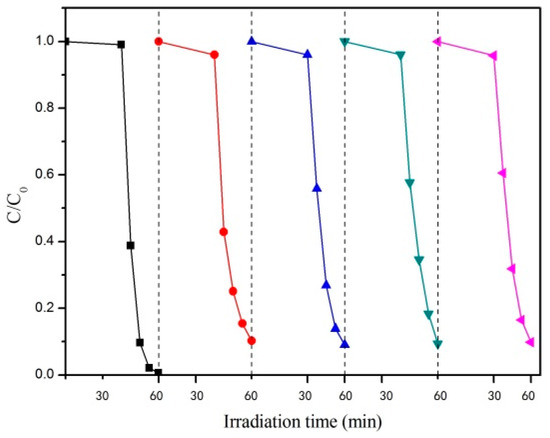 The recycling performance of the catalyst is an important factor reflecting its stability and practical application performance. Therefore, we investigated the recycling performance of the optimum CaCO3–TiO2 composite photocatalyst (the particle size of CaCO3 was 15 μm, the mass ratio of TiO2 was 40%). The results are shown in Figure 4. The results show that the photocatalytic degradation performance of CaCO3–TiO2 after five cycles is similar to that of the first use, indicating that recycling does not reduce its performance. This indicates that the CaCO3–TiO2 composite photocatalyst prepared in this study has excellent recycling performance and can be recycled and reused several times, thereby reducing the cost. Obviously, this is due to the loading of TiO2 on the surface of CaCO3, which results in the nano-TiO2 being firmly fixed on the surface of CaCO3. Therefore, the loss of TiO2 is prevented, and CaCO3–TiO2 can easily be separated from water due to its large particle size. However, single nano-TiO2 particles have a small particle size, so they are difficult to precipitate and easily lost when separated from their carrier. Therefore, it is believed that the CaCO3–TiO2 composite photocatalyst has practical application prospects for sewage treatment.