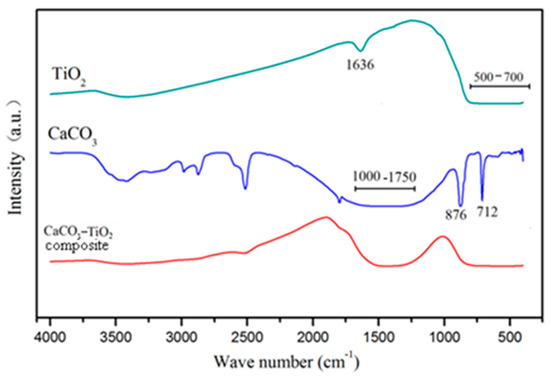 The infrared spectra of CaCO3, nano-TiO2 raw material and CaCO3–TiO2 composite photocatalyst were measured, as shown in Figure 8. In the infrared spectrum of nano-TiO2, the wide absorption band in the range of 3250–3700 cm−1 and the absorption peak at 1636 cm−1 respectively represent the stretching vibration and bending vibration of the O–H bond in the water molecules and hydroxyl groups on the surface of TiO2. The absorption band in the range of about 3300–3500 cm−1 in the CaCO3 spectrum represents the characteristics of adsorption water and hydroxyl groups on its surface. In the infrared spectrum of the CaCO3–TiO2 composite photocatalyst, the absorption peak at 1636 cm−1 of TiO2 disappeared, and the absorption peak of CaCO3 ranging from 3300 to 3500 cm−1 was weakened. It has been suggested that CaCO3 and TiO2 form a firm chemical combination through their surface hydroxyl groups [24].