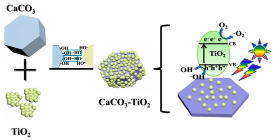 Based on the above study, the mechanism of CaCO3 as a carrier to improve the photocatalytic performance and utilization efficiency of nano-TiO2 can be summarized as follows: (1) The dispersibility of TiO2 is improved by uniformly loading TiO2 on the surface of CaCO3, thereby causing an increase in active sites and light absorption areas. (2) A chemical bond is formed between TiO2 and CaCO3 at their interface, which provides a new transport channel for the photo electrons [25,26], and further improves the separation efficiency of electrons and holes. (3) In CaCO3–TiO2, nano-TiO2 and CaCO3 are firmly combined due to their surface chemical bonding, which prevents the loss of TiO2 when degrading pollutants in water [9,27]. Therefore, this composite photocatalyst can be easily recovered and recycled from water by sedimentation, thereby reducing the use amount of TiO2 as well as the cost. Figure 9 is a schematic diagram reflecting the above principles.
