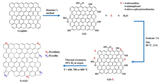 The mechanism of formation of N-rGO is still a fascinating phenomenon because it is not well understood and there is more that can be done to manipulate it. Therefore, synthetic procedures for N-rGO need a certain level of control regarding the required extent of doping and the bonding configuration of nitrogen. Different synthetic approaches have been employed in the in-situ synthesis of N-rGO, such as arc discharge [31], plasma method [32], thermal annealing [33] and chemical vapor deposition (CVD) [34,35]. The CVD approach is mostly preferred because it is easier to scale-up and produces relatively high-quality N-rGO. Scientific reports on the synthesis of N-rGO via the CVD approach indicate that the mostly used materials are metal catalyst (Cu, Ni, Co or Fe) [36,37] and organic molecules [38].