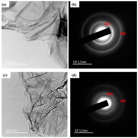 HR-TEM image of (a) GO, (b) SAED pattern of GO, (c) HR-TEM image of N-rGO-1N-600 °C and (d) SAED pattern of N-rGO-1N-600 °C.