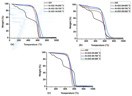 The decomposition behavior of N-rGO was investigated by the thermogravimetric analysis (TGA). The synthesized N-rGO exhibited different thermal stabilities. TGA weight loss curves of N-rGO-1N, N-rGO-2N, and N-rGO-3N are shown in Figure 4a, Figure 4b, and Figure 4c, respectively.