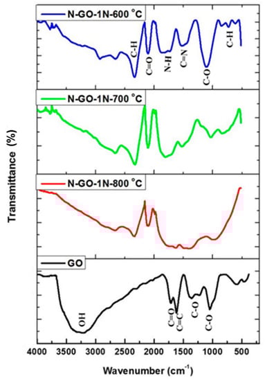 N-rGO and GO were characterized by means of FTIR spectroscopy to investigate the effect of doping temperatures and nitrogen precursors on the functional groups present in the N-rGO. The FTIR spectral patterns of all the N-rGO samples were used to identify the presence of different functional groups, by comparison with that of GO (Figure 6).